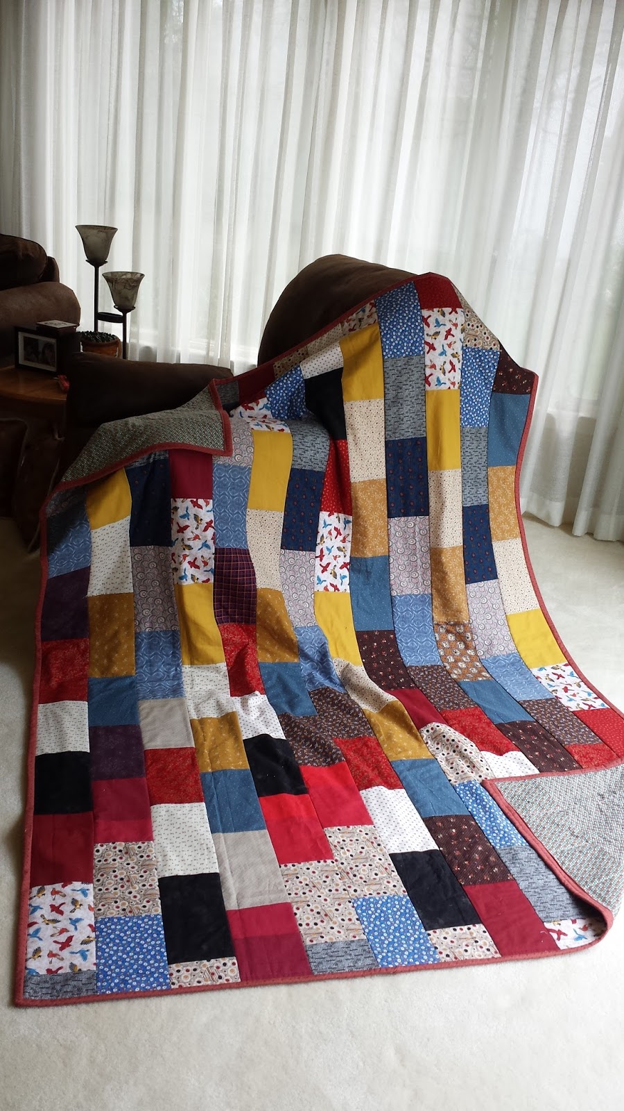 Last week I went down to visit my Dad.... he is stable but not really good. He will be 81 this summer. While I was there I finished this charity quilt that I started making with our group at Church. The only difficult thing with this pattern is managing the size... you sew the blocks into strips, then attach the strips to the batting and backing so it is pieced together and quilted at the same time. Managing the bulk and getting all that through the sewing machine takes some doing!