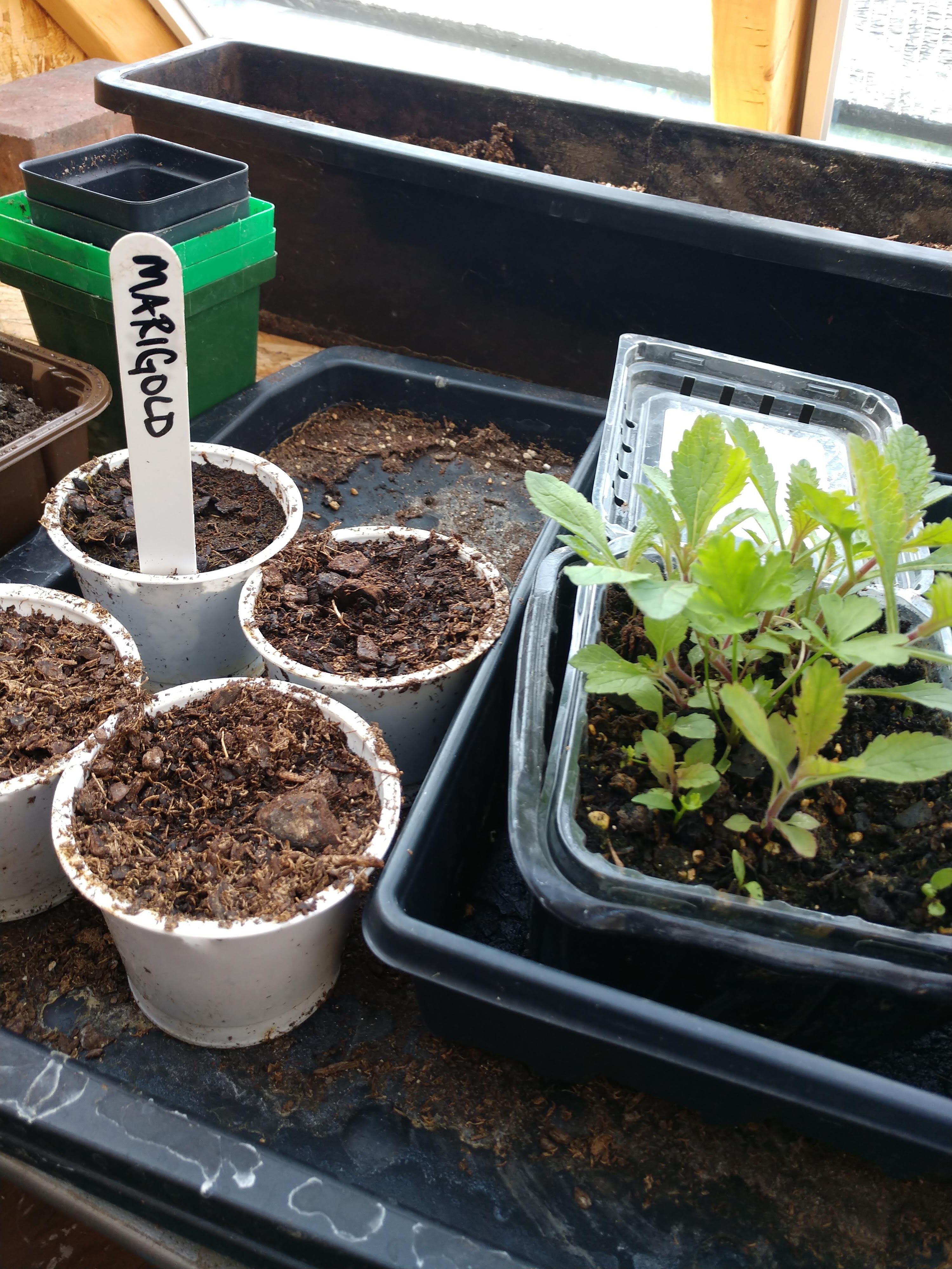 | NOW correctly labeled Lemon Gems and the mystery plant that came up with the parsley in the container on the right! I think it might be Verbeena flowers that I planted in that container last year! |
